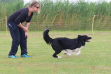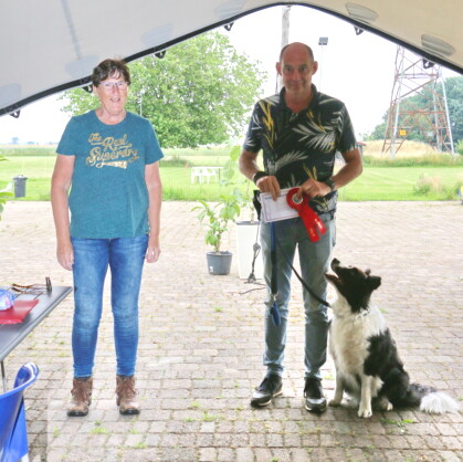 Wat zijn jullie samen gegroeid in de afgelopen maanden. Zo knap hoe hij onder je hand blijft lopen. Jammer van het anticiperen in de recall. En de erg scheve zit in de retrieve. Maar erg leuk om jullie te mogen keuren ! ( 6 1/2 pnt ) Ook in de trainingsronde heb ik erg mooie rondes gezien. Dat beloofd wat voor de toekomst. Ik wens iedereen een fijne vakantie en ik hoop dat we elkaar allemaal weer zien op 28 augustus in Schiedam